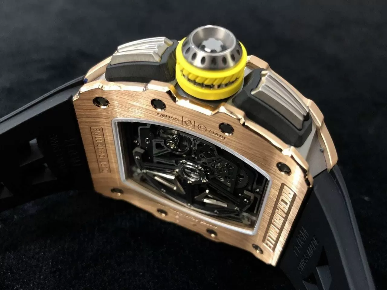 Model này sử dụng dây đeo bằng cao su thiên nhiên cao cấp. Sợi dây mềm ôm tay, thoáng khí, cực kỳ chắc chắn. Bộ khóa dây cũng bằng vàng khối trang trí thêm những viên kim cương sang trọng. Mặt số Richard Mille RM011-03 Skeleton giúp phô trương toàn bộ vẻ đpẹ của cỗ máy bên trong.