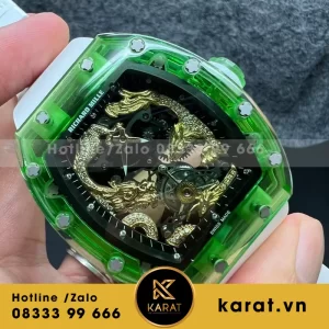 Mặt số được thiết kế thấu kính ấn tượng, với điểm nhấn là nghệ thuật chạm khắc rồng 3D mô phỏng bản hãng. Bộ kim được hoàn thiện sắc gọn, kết hợp mặt kính sapphire trong suốt cho độ hiển thị rõ nét. Phiên bản chế tác cho cảm giác sâu – thật – và sống động, tái hiện tinh thần kiến trúc cơ học đặc trưng của dòng RM57.
