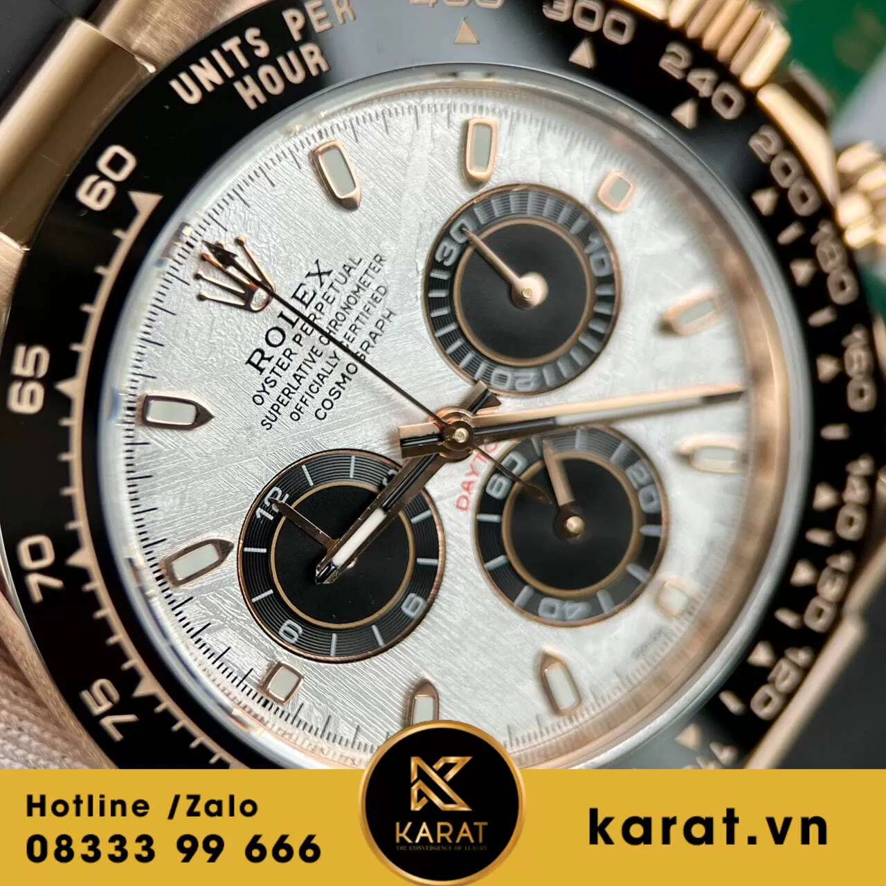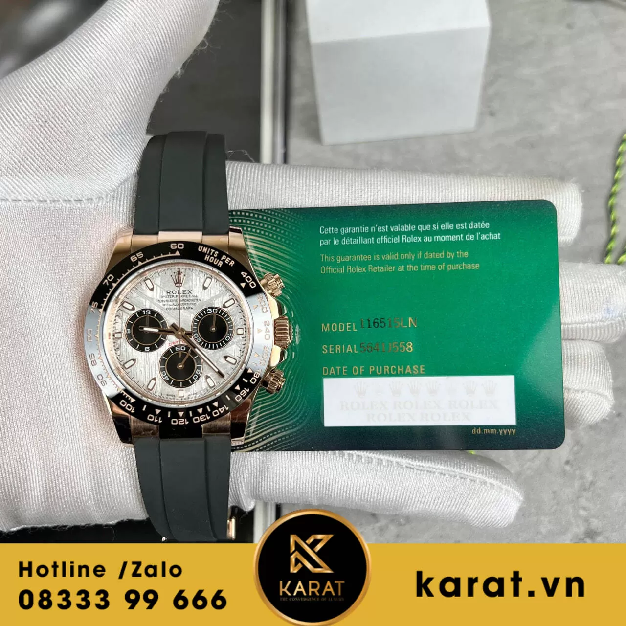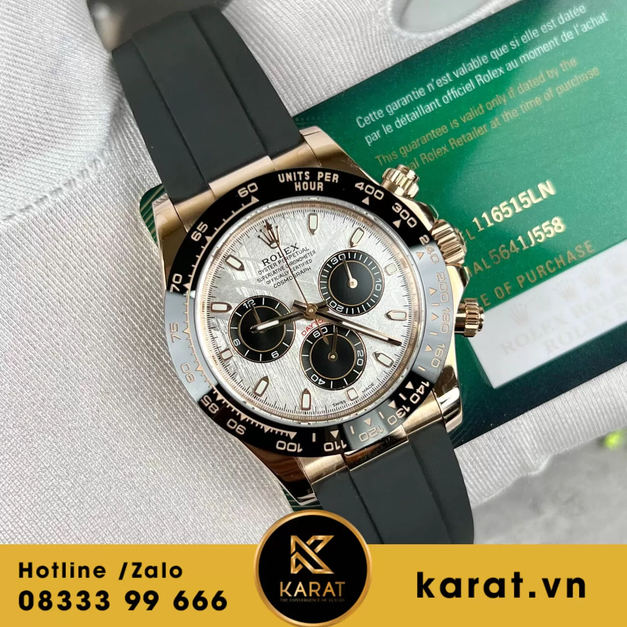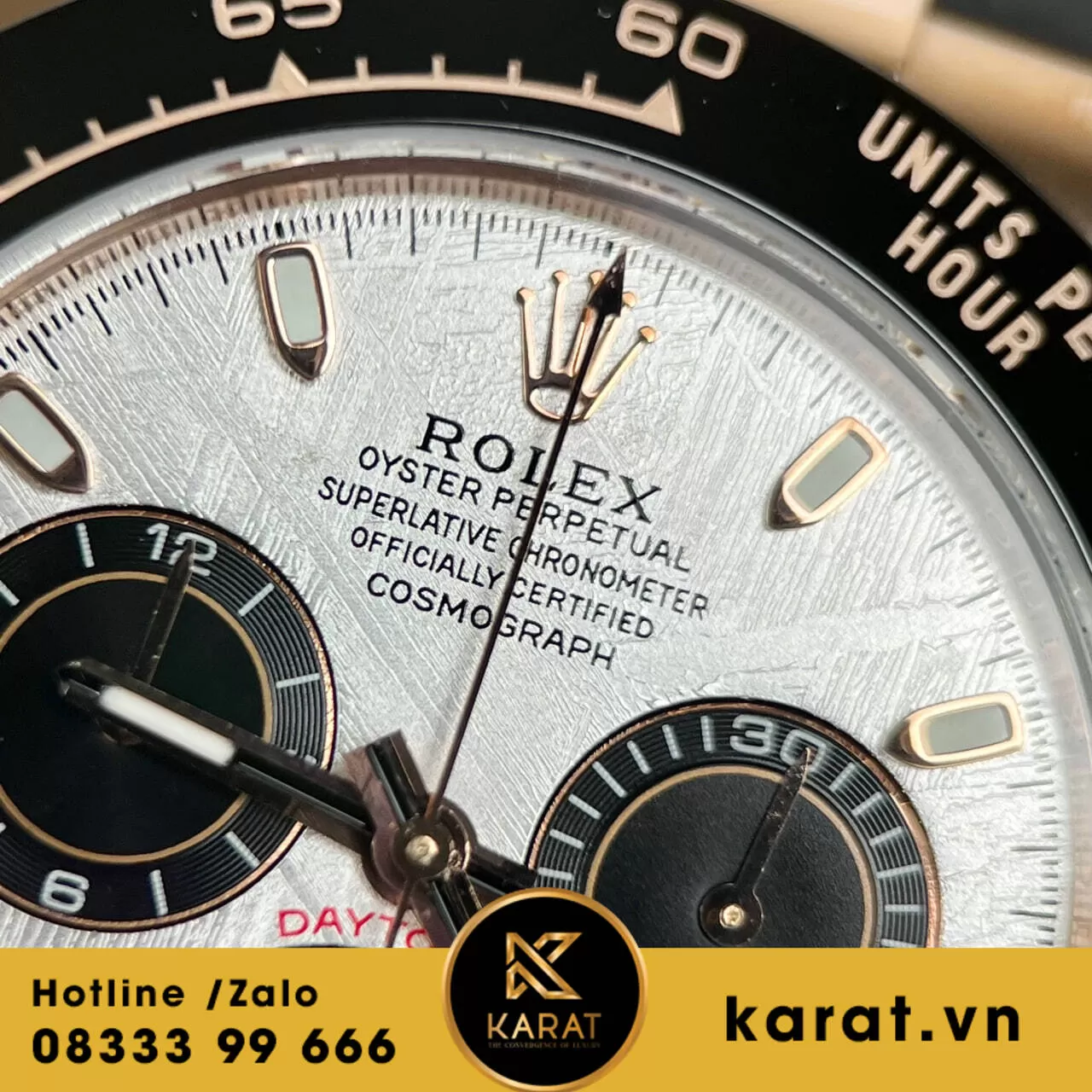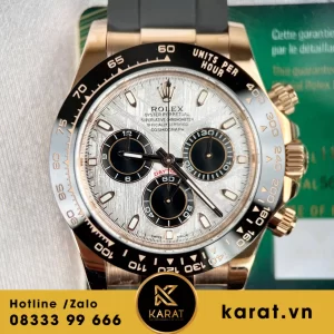 Quý khách có thể sở hữu phiên bản này với giá 220.000.000 VNĐ. Đồng hồ Rolex Cosmograph Daytona 116515 Vàng Hồng Mặt Thiên Thạch đang có sẵn tại karat.vn. Hãy liên hệ ngay hôm nay để đặt mua chiếc đồng hồ đẳng cấp này.
