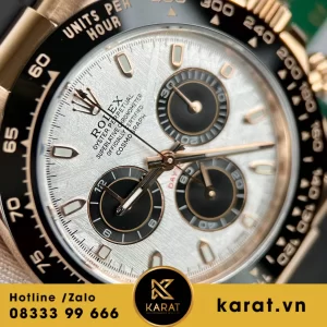 Chiếc Daytona 116515 này được chế tác với vàng khối 18K, mang đến vẻ đẹp quý phái và sang trọng tuyệt đối của Rolex Replica này . Mặt thiên thạch được tinh chỉnh một cách tỉ mỉ, làm nổi bật thêm vẻ đẹp tự nhiên và sự quý phái của đồng hồ.