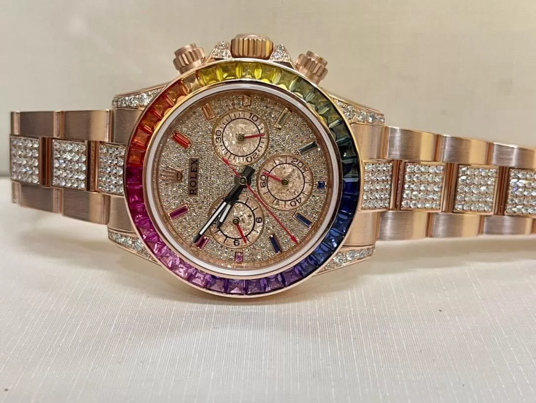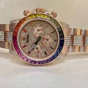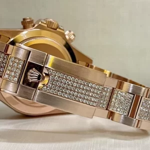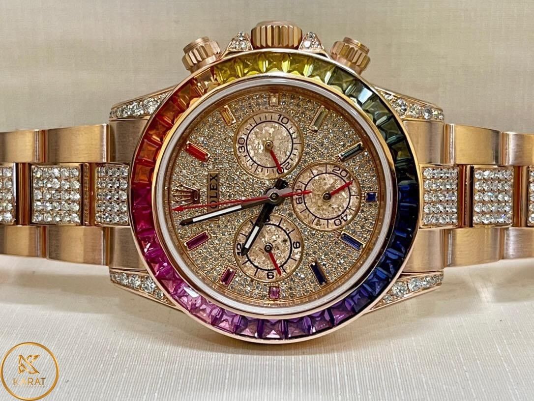 Có thể bạn chưa biết, chiếc đồng hồ Rolex từng được bán đấu giá đắt nhất nằm trong bộ sưu tập Daytona. Trong bộ sưu tập này có rất nhiều mẫu đẹp, hiện đại, đa tính năng với mức giá cao nhất thương hiệu. Sự đắt đỏ của nó khiến phần đông khách hàng không thể chạm tay tới. Nếu bạn muốn trải nghiệm, Karat giới thiệu đến quý khách hàng model Rolex Cosmograph Daytona 116595RBOW chế tác vàng hồng 18k mặt số và dây đính kim cương với độ hoàn thiện đến 99% với giá rất ổn.