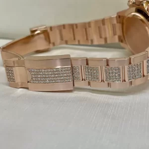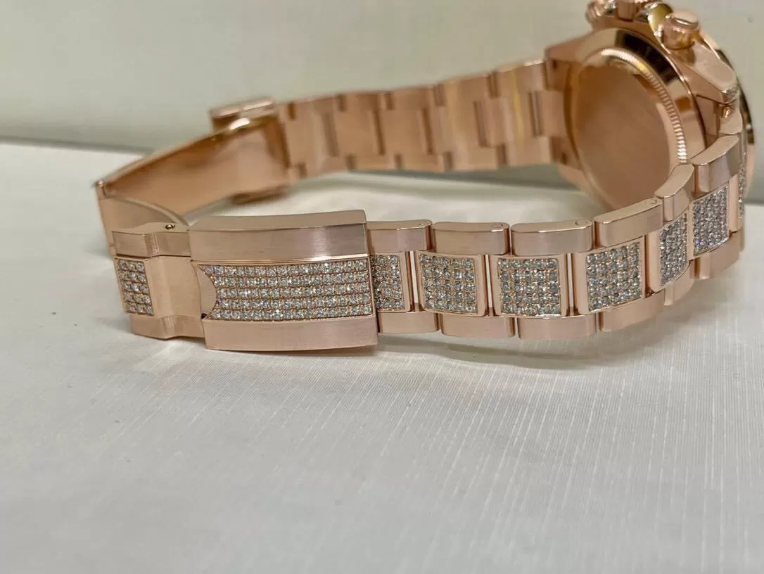 Mọi chi tiết trên đồng hồ Rolex Cosmograph Daytona 116595RBOW chế tác rose gold mặt số và dây đính kim cương được gọt giũa một cách tỉ mẫn, công phu với độ hoàn thiện gần như tuyệt đối. Khi đeo nó lên tay chắc chắn không ai nhận ra đâu là hàng auth đâu là hàng chế tác. Vì thế, không ít khách hàng dù đã sở hữu một model hàng hãng vẫn tậu thêm em này để thỏa mãn đam mê.