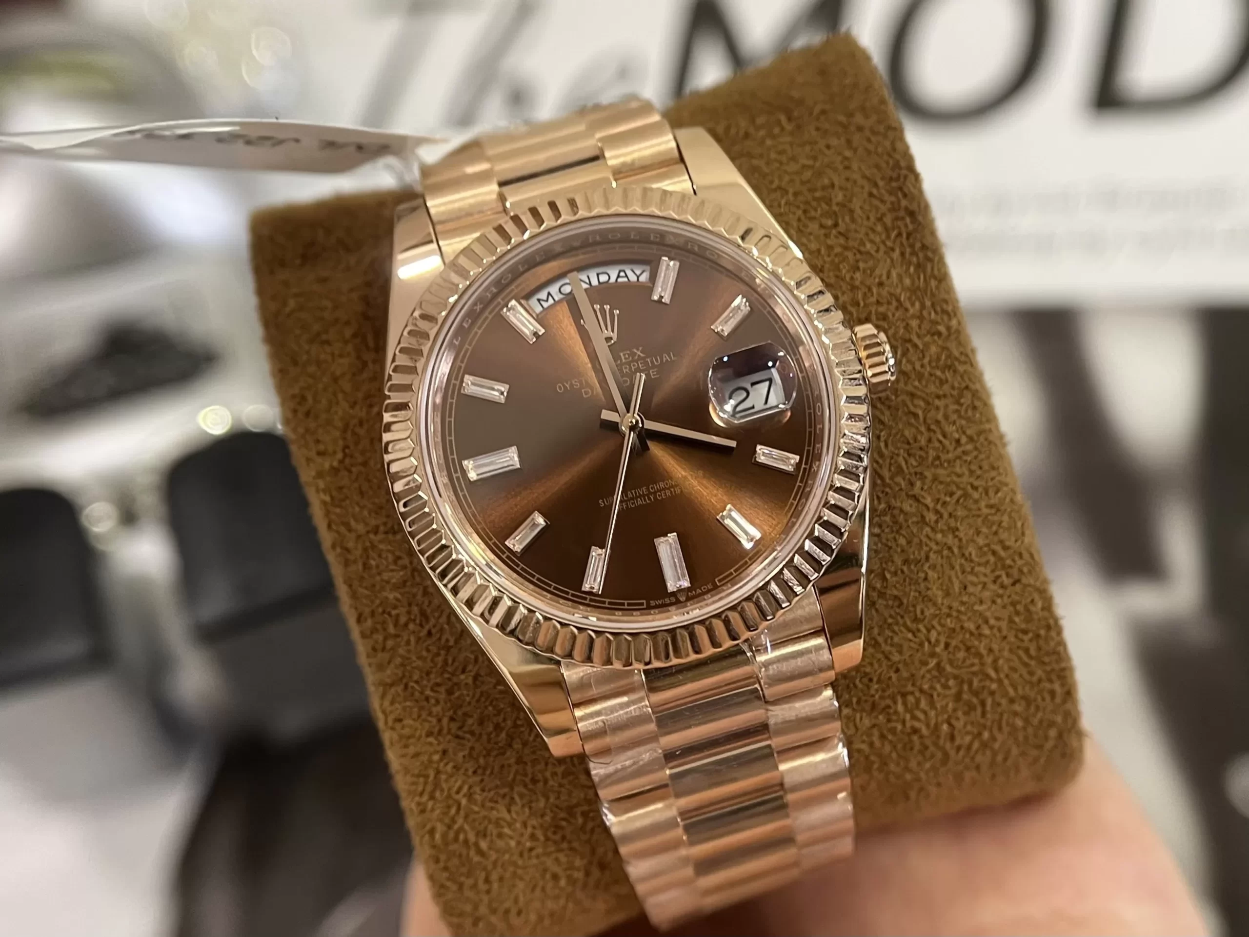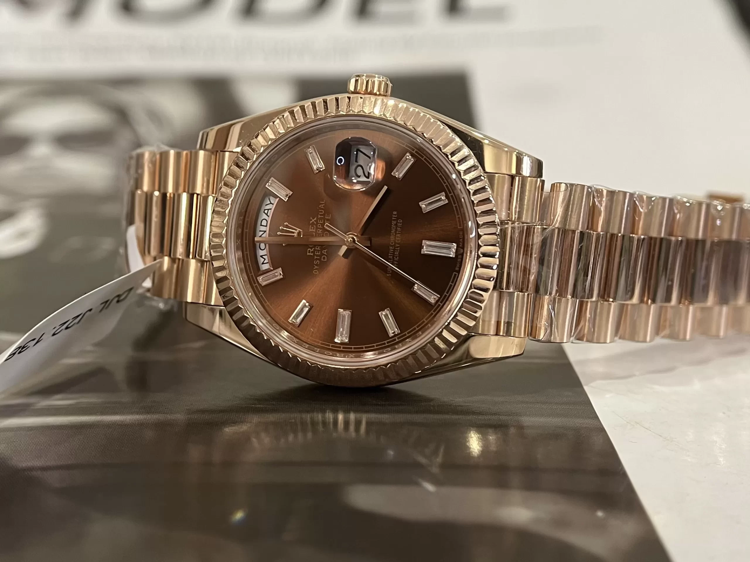 Vẻ đẹp cổ điển, lịch lãm của đồng hồ ROLEX DAY-DATE 40MM CHOCOLATE ROSE GOLD 228235-0003 CHOCOLATE DIAL