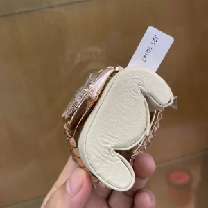 Dây đeo đồng hồ làm bằng vàng khối kiểu President 3 khớp nối mảnh, tinh tế, xa hoa. Núm điều chỉnh có tính chống nước Twinlock giúp cỗ máy này kháng nước đến 100m. Trái tim bên trong là máy Caliber 3156 tự động. Máy được sản xuất in house, sử dụng dây tóc Parachrom, bộ chống sốc Paraflex giúp giảm thiểu mọi tác động từ bên ngoài. Máy 3156 được cấp giấy chứng nhận đạt chuẩn COSC nên hoạt động ổn định, bền bỉ, chuẩn xác. Tần số gõ nhịp là 28.800vph, dự trữ cót đạt 48 giờ.