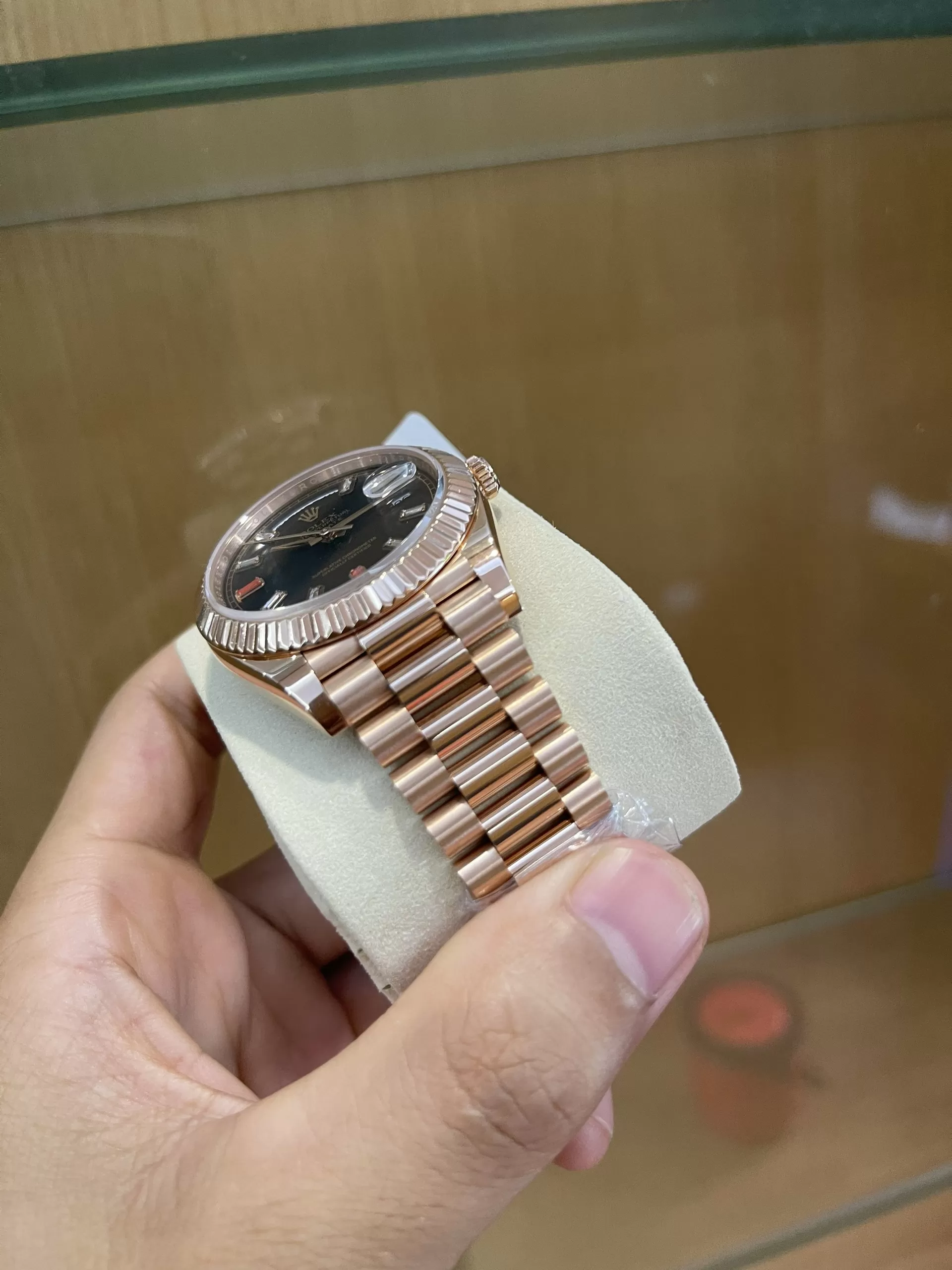 Các chi tiết trên đồng hồ Rolex Day-Date II 218235 Mặt Số Đen Chế Tác Vàng Đúc 18k đều được gọt giũa một cách tỉ mẫn, công phu với độ hoàn thiện gần như tuyệt đối. Khi đeo nó lên tay chắc chắn không ai nhận ra đâu là hàng auth đâu là hàng chế tác. Vì thế, không ít khách hàng dù đã sở hữu một model hàng hãng vẫn tậu thêm em này để thỏa mãn đam mê.