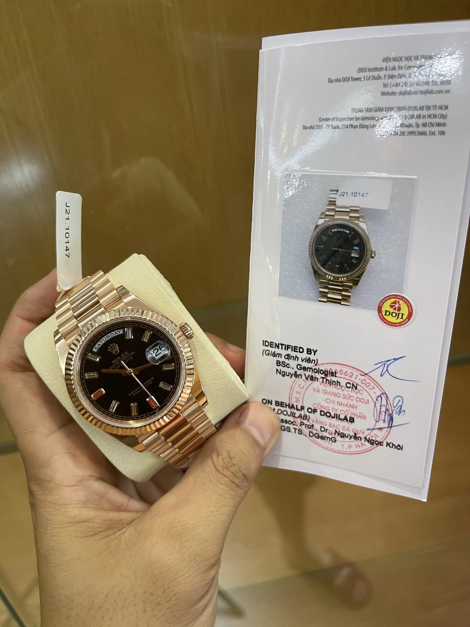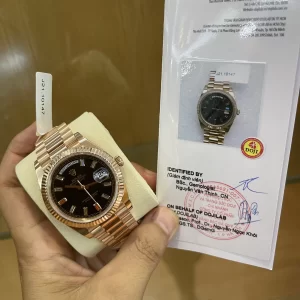 Rolex Day-Date II 218235 Mặt Số Đen Chế Tác Vàng Đúc làm từ vàng 18k nguyên khối như hàng hãng. Những viên kim cương đính trên đồng hồ là kim cương thiên nhiên chất lượng cao với nước DVVS1 cực sáng. Đồng hồ được đi kèm là hộp sổ thẻ như hãng và giấy kiểm định vàng và kim cương từ các trung tâm kiểm định uy tín như DOJI và GIV. Khách hàng có thể kiểm định lại ở bất cứ đâu nếu không phải vàng và kim cương chúng tôi sẽ đền tiền gấp đôi.