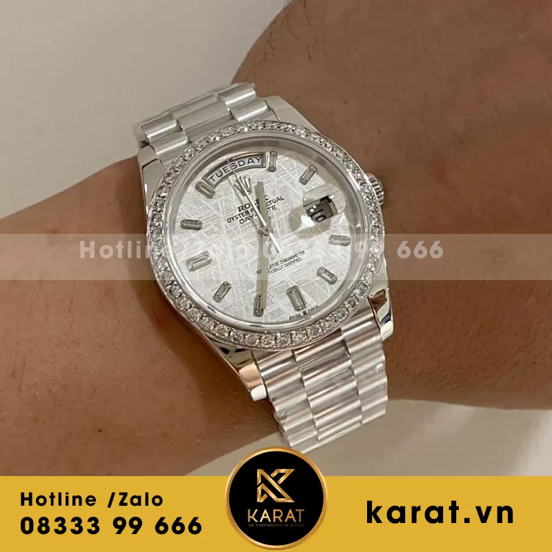 Rolex daydate 40mm mặt số thiên thạch vàng trắng 18k nạm kim cương