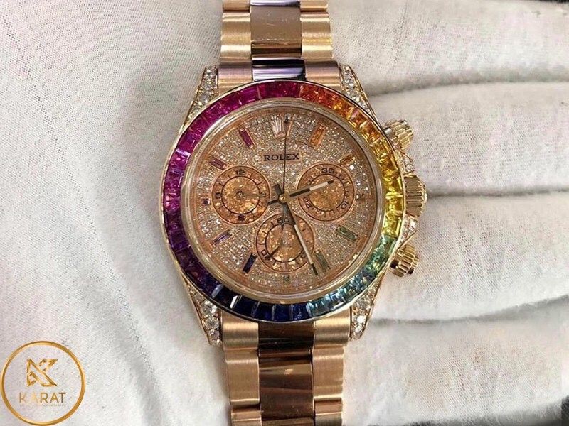 Rolex Daytona Rainbow 116595RBOW xuất hiện năm 2018 trong bộ áo bằng chất liệu vàng Everose độc quyền của bản hãng. Ngay sau màn ra mắt ấn tượng này, thị trường đồng hồ được phen dậy sóng. Giới mộ điệu không ngừng lùng sục model này dù giá siêu đắt đỏ. Hiểu rõ sức nóng, độ khan hiếm của siêu phẩm bản hãng, Karat mang đến mẫu Rolex Daytona Rainbow 116595RBOW diamond vàng khối 18k Ruby thiên nhiên chế tác với độ hoàn thiện cao nhưng giá mềm hơn rất nhiều.